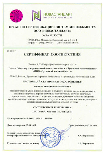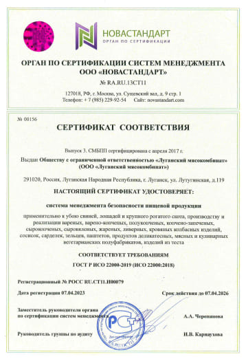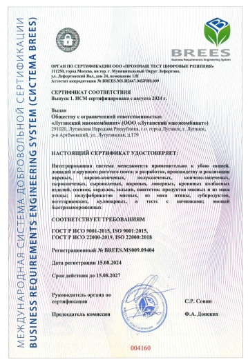 Согласно действующего российского законодательства на предприятии разработана, внедрена и успешно функционирует Интегрированная система менеджмента качества и безопасности пищевых продуктов, основанная на принципах НАССР. На сегодняшний день Интегрированная система сертифицирована в международной системе добровольной сертификации (СИСТЕМА BREES) на соответствие национальных стандартов, гармонизированных с международными, и международных стандартов по последним версиям ISO (ISO 9001, ISO 22000). Работы успешно прошли в московском аккредитованном органе по сертификации.