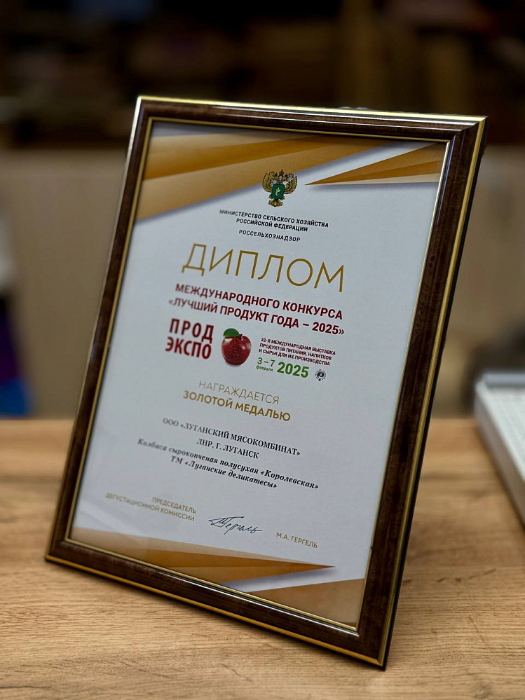 Коллектив ООО «Луганский мясокомбинат»  с гордостью сообщает, что с 3 по 7 февраля 2025 года принял участие в 32-ой международной выставке «Продэкспо-2025» (г. Москва), в рамках которой участвовал в международном дегустационном конкурсе «Лучший продукт года - 2025» и награжден золотыми медалями и дипломами за звание «Лучший продукт года - 2025» за все заявленные 12 наименований колбасно-деликатесной продукции: